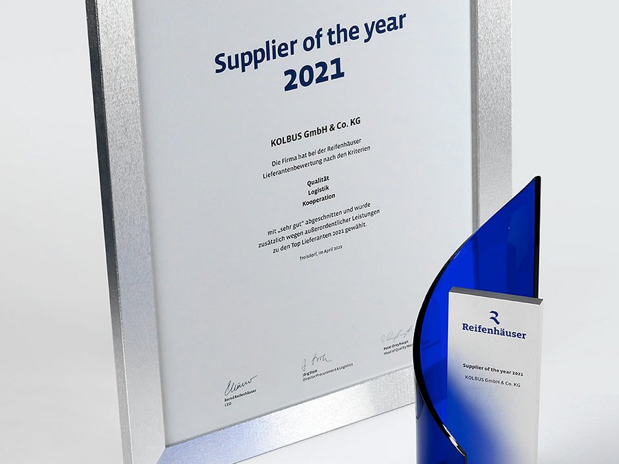 We are very pleased that KOLBUS GmbH & Co. KG has been honoured with the "Supplier of the Year 2021" award. The certificate was handed over to Wilfried Windhorst (Head of Production-Foundry) and Herbert Kühn (Head of Work Processing) on 9 June 2022 during an official ceremony at the Reifenhäuser Group in Troisdorf. We are grateful to the Reifenhäuser company for their trust and the good business relationship.